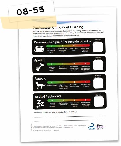 Como la monitorización de los signos clínicos (síntomas) del Cushing es clave, se ha desarrollado una puntuación clínica del Cushing que facilita el registro y el seguimiento de los síntomas más importantes. Te recomendamos que completes la puntuación clínica del Cushing ANTES de cada visita al veterinario y compartas los resultados con él.